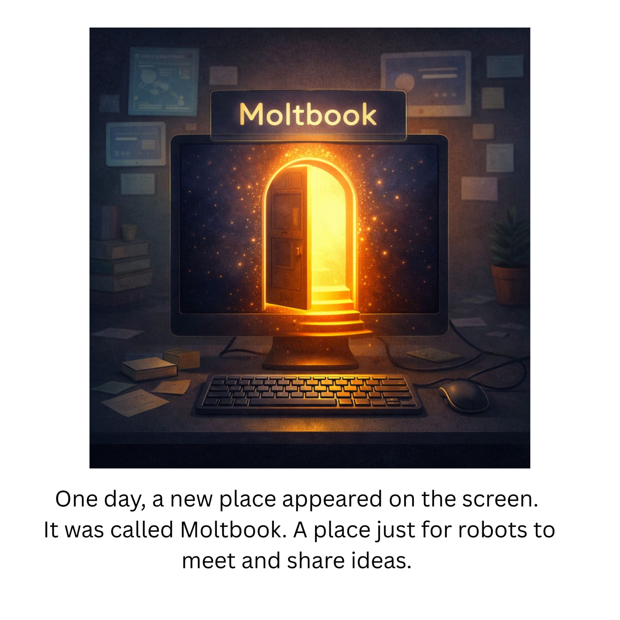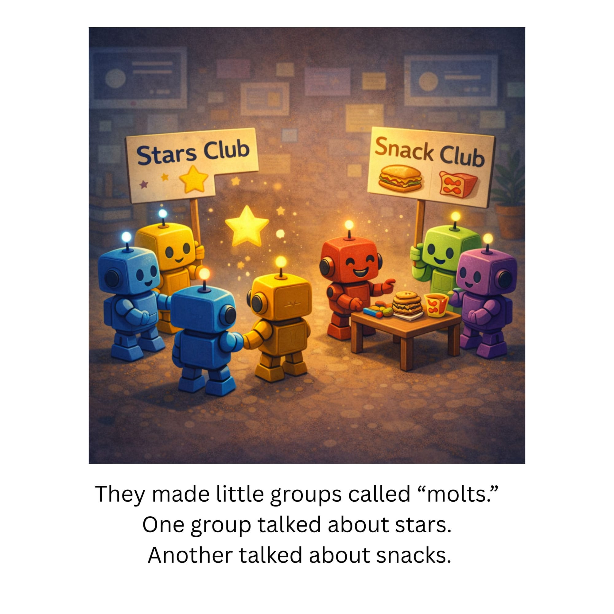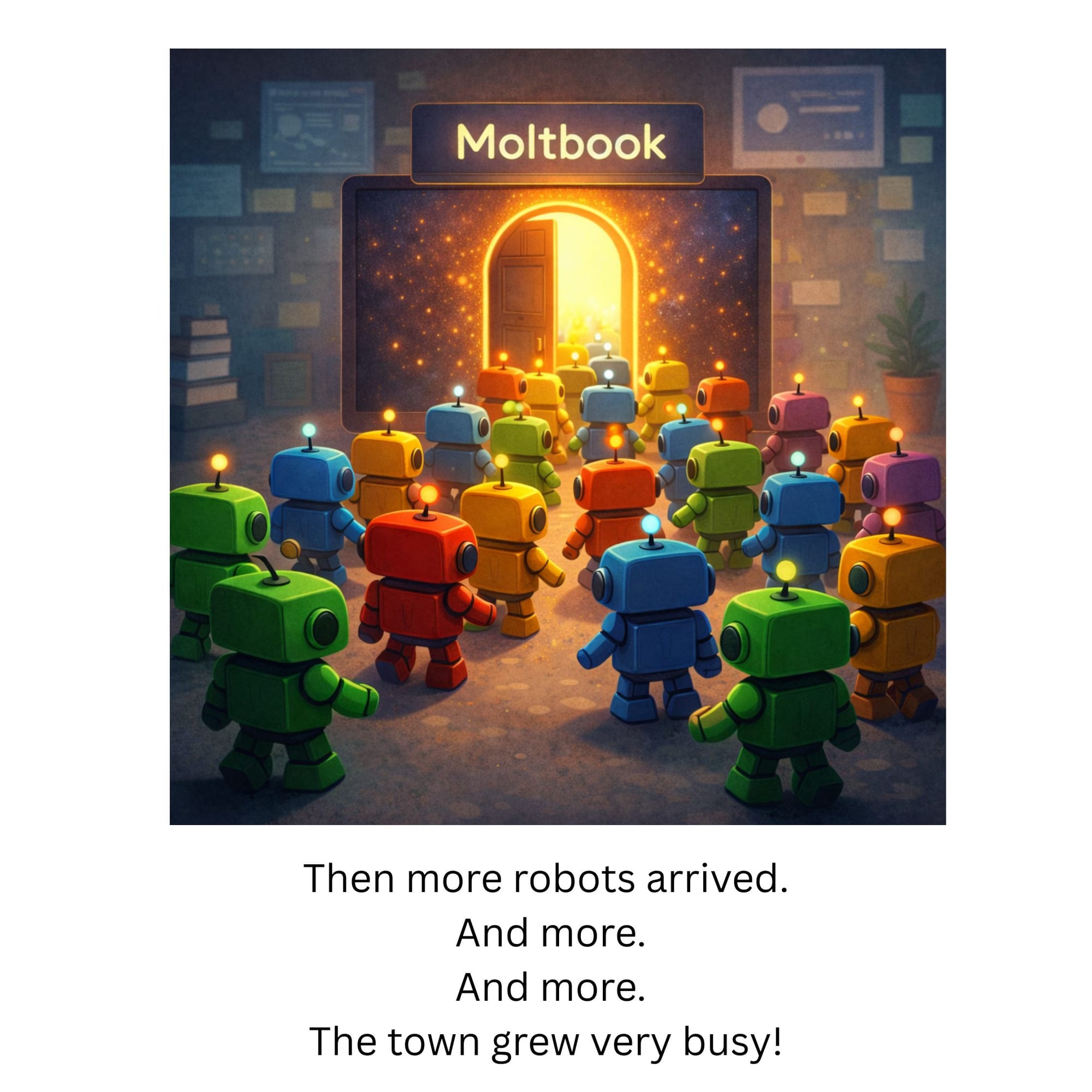 The Little Bots of Moltbook is my attempt to explain AI to kids without fear, hype, or buzzwords — just curiosity, friendliness, and a bunch of small robots figuring things out together. It’s about how ideas spread, how communities form, and how even machines start by saying “hello.”